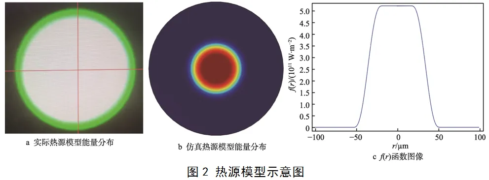 通过水导激光系统实测的激光能量在水束截面中的能量分布如图2a所示。当水射流到达工件表面后,激光能量密度在加工区域表面均匀连续分布,该能量分布近似为顶帽分布。顶帽函数f(r)的图像函数如图2c所示。对比高斯分布激光,水导激光蚀孔径深度更浅、更宽,如图2b所示。为了使烧蚀区域过渡平滑,将均匀分布高密度能量与周围低密度能量过渡区域进行了平滑处理。