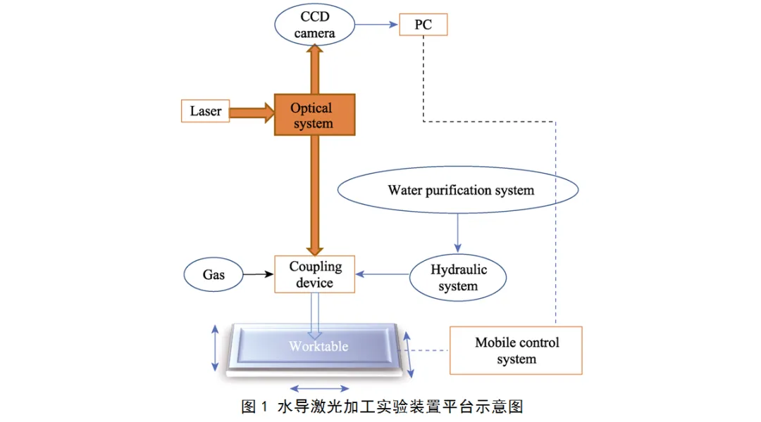 水导激光作为一门新兴加工技术,具有较低的热效应及较高的精度,逐渐广泛应用于各种硬脆性材料的加工。由于水导激光的烧蚀机理较复杂,因此材料的烧蚀行为也存在差异。中国科学院沈阳自动化研究所乔红超研究员团队为了更加深入地研究水导激光作用下SiC材料的烧蚀行为,建立了SiC水导激光加工烧蚀温度场数值模型,着重探究了SiC材料加工时温度场的变化。由于水射流强制换热作用对加工的影响较大,故将水射流贴壁射流流场换热进行细分和计算,使得水射流换热作用与实际加工更接近。SiC到达熔点气化,结合Clausius-Clapeyron方程通过气化带走热通量反求出蚀孔的形貌,从而较准确地分析激光烧蚀过程,以及SiC材料加工时温度场的变化规律。目前,水导激光烧蚀机理研究还未形成较完善的体系,本研究主要将飞秒激光烧蚀阈值思想融入水导激光烧蚀机理中,并结合烧蚀实验探究水导激光作用下SiC的烧蚀阈值,并对SiC材料的烧蚀形貌进行分析和研究,揭示SiC材料的水导激光加工去除行为。采用自主研发的水导激光加工系统实验装置进行加工,如图1所示。该系统主要由激光器、水净化系统、耦合装置、三维工作平台、CCD相机、计算机等组成,采用532 nm的Nd:Yag固体激光器,其峰值激光功率为100 W,输出频率为50 kHz,脉冲宽度为100 ns。为了减少水对激光能量的吸收,将实验用水过滤、去离子和除气,调节高压水泵,使得水压稳定在30 MPa。激光束被聚焦在直径70 μm的水喷嘴中,并与水射流进行耦合,形成水束光纤,激光能量通过水射流被引导至工件,完成加工。