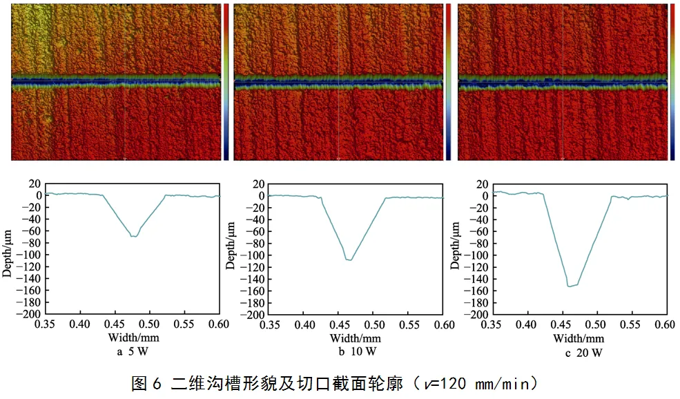在不同功率下的二维形貌及切口轮廓截面形状如图6所示。由于激光能量在水射流中心近似为高斯顶帽分布,射流中心能量密度较大,材料更易被烧蚀,而其外侧附近能量较弱,加上水射流局部换热较强,较难达到材料的烧蚀条件,使得截面轮廓整体呈倒梯形,且随着激光功率的增加,沟槽深宽比逐渐增大。SiC烧蚀边缘与未加工边缘过渡平滑,与常见激光加工不同,加工边缘不会产生较厚的重铸层,烧蚀区域形成的软化物质基本被水射流冲刷而剥离,不会富集在材料表面,使得烧蚀区域基本无明显热影响区。在加工完成后,会在侧壁表面形成带状条纹,该条纹垂直于进给方向。这主要因水射流接触熔池底部后沿着平行于侧壁的方向喷射,将熔融物沿底部向沟槽上方冲刷,烧蚀区域底部无明显重铸物堆积,较为平整。由于存在水射流冷却和冲刷作用,因此水导激光在加工硬脆性材料时具有相对较好的优势,基本可以实现对硬脆性材料无裂纹及无热影响加工。