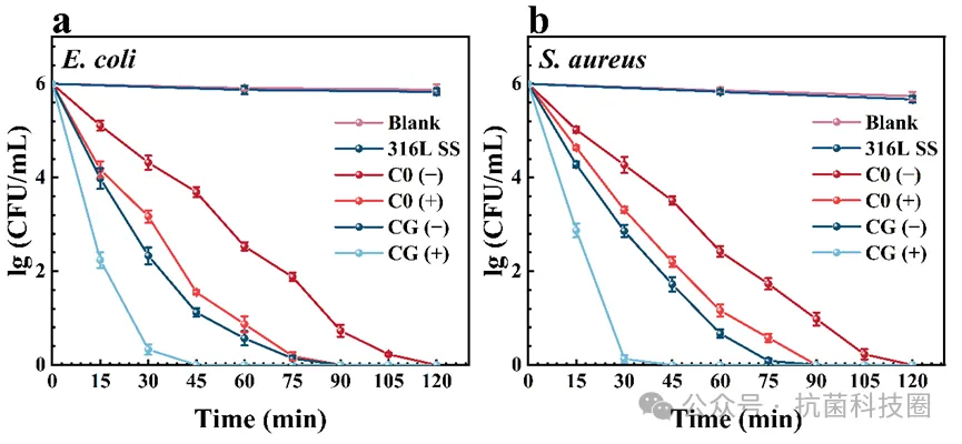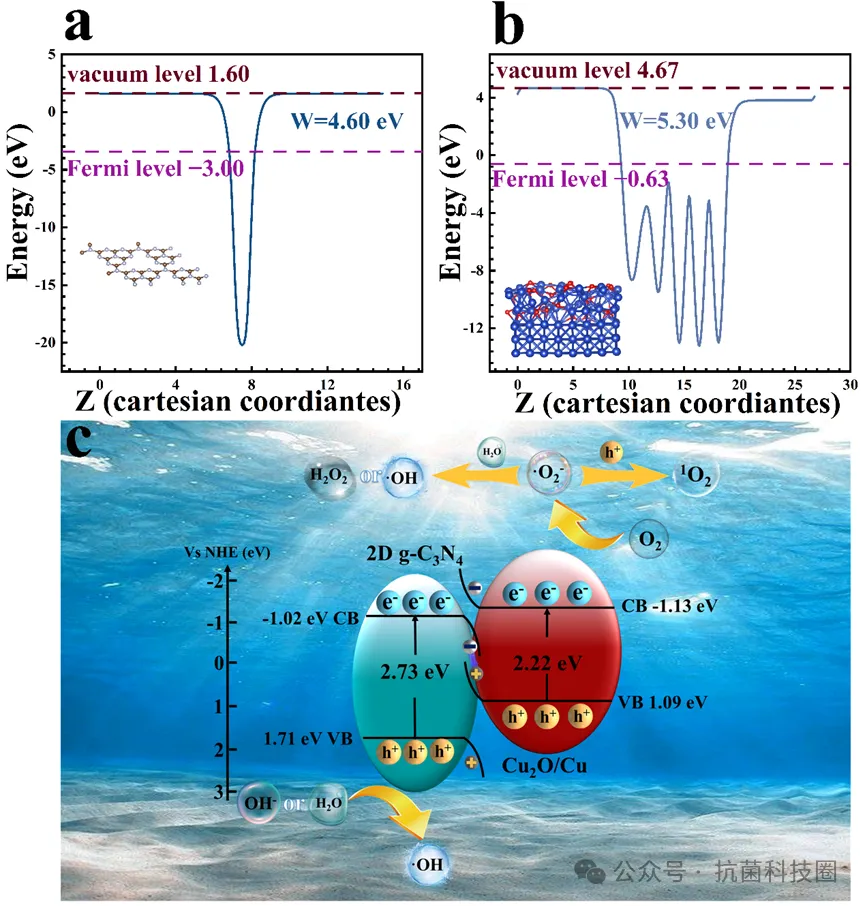 微生物腐蚀是金属材料腐蚀失效的主要原因之一,会造成巨大的经济损失。Cu2O作为一种有效的光催化抗菌涂层有望成为微生物腐蚀的解决方案。然而,光腐蚀和电荷分离效率低等缺陷限制了其应用。基于此,河北科技大学李建辉教授团队成功合成了一种新型高效抗菌g-C3N4/Cu2O/Cu涂层。 2D g-C3N4超薄多孔结构为Cu2O和Cu沉积提供了充足的活性位点,提高了电流效率,同时增强了光吸收和电子传输能力。此外,2D g-C3N4和Cu2O/Cu之间形成S型异质结可有效抑制Cu2O光腐蚀。 值得注意的是,由于铜离子的协同杀菌作用和活性氧的产生,该涂层在光照和黑暗条件下都能在1小时内快速杀灭大肠杆菌和金黄色葡萄球菌。同时,该涂层对铜绿假单胞菌引起的316L不锈钢微生物腐蚀具有显著的抑制作用。