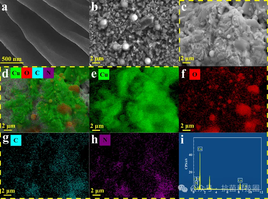 电沉积电位(a)和效率与质量(b),XRD图谱(C),XPS测量光谱(d),镀层中Cu 2p (e),O 1s (f),C 1s (g),N 1s (h)的XPS光谱