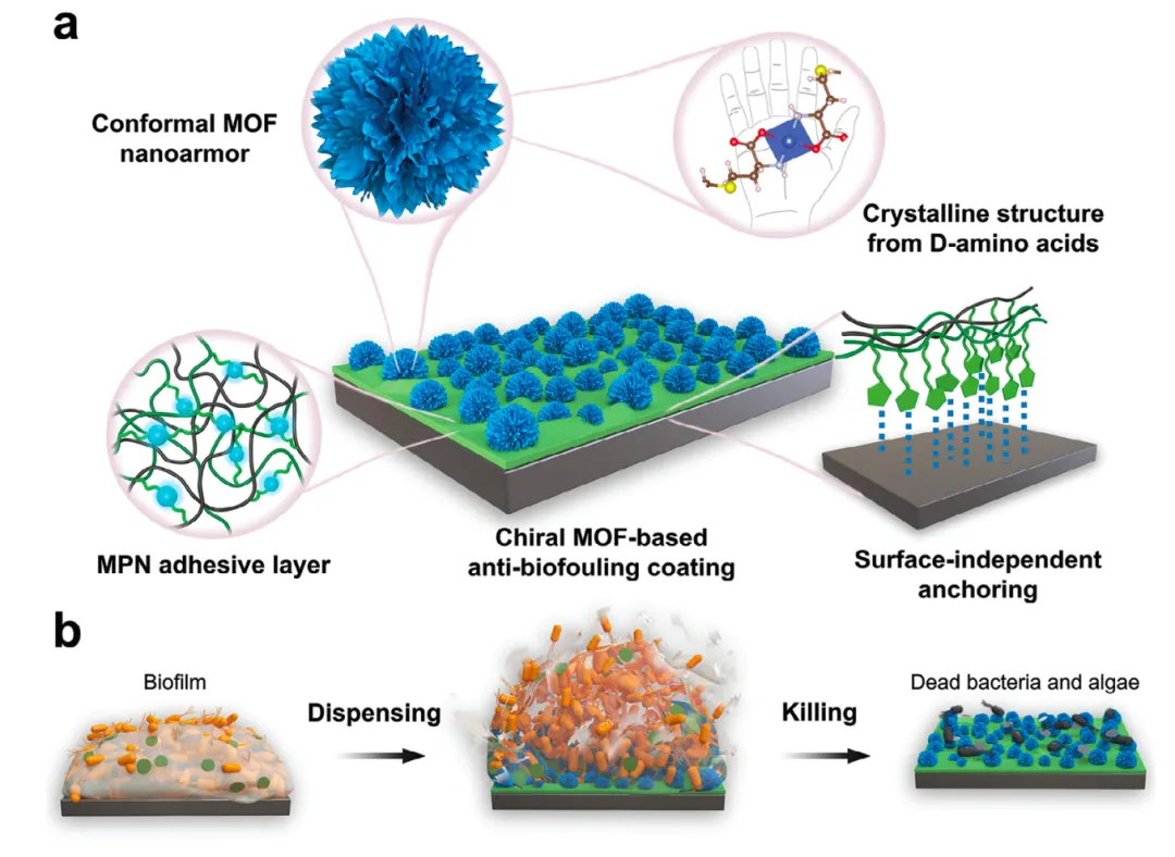 表面涂层旨在减轻普遍存在的生物污损,预示着复杂生物环境中表面保护的新时代已经到来。然而,尽管使用了杀菌剂,现有策略仍受到持续和反复出现的生物膜附着问题的困扰。 2024年9月5日,东北大学王福会教授、徐大可教授(2024年度国家杰出青年科学基金获得者)、李祥宇副教授团队在Advanced Materials期刊发表题为“Robust Chiral Metal–Organic Framework Coatings for Self-Activating and Sustainable Biofouling Mitigation”的研究论文,东北大学材料学院于智群为论文第一作者,李祥宇副教授、徐大可教授为论文共同通讯作者。https://onlinelibrary.wiley.com/doi/10.1002/adma.202407409 该研究发了一种手性金属有机框架(MOF)涂层,该涂层具有保形微结构,可实现一种新的防生物污损模式,即自发生物膜分解后消灭细菌。 手性MOF的防生物污损涂层示意图 图源:Advanced Materials