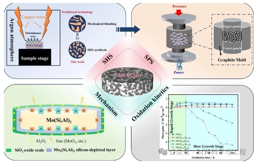 - 通过SHS原位合成Mo(Si,Al)2粉末,并通过SPS制备具有致密结构的复合材料。