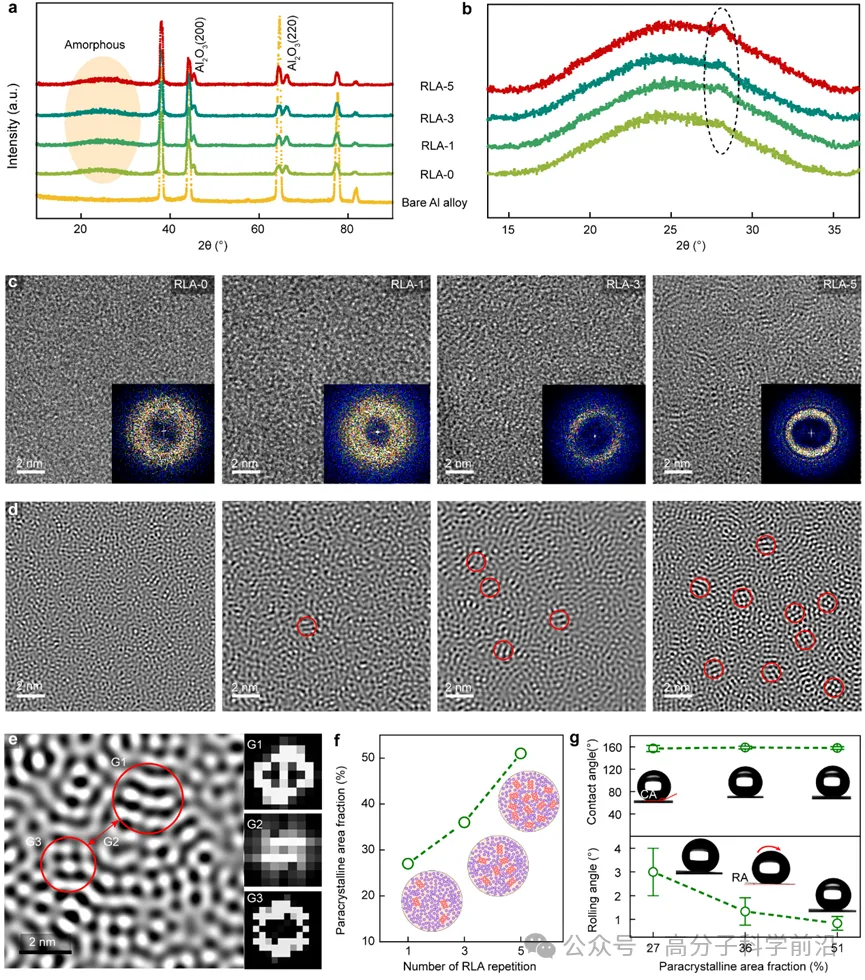 GIXRD分析测试结果显示,仅是经过FLEM处理后的铝合金表面呈现出非晶态特征,这一发现表明FLEM处理促进了材料表面的非晶化过程。相比之下,经过后续RLA处理后的样品表面在2θ28°位置处出现了微弱的衍射峰,并且随着RLA次数的递增,该衍射峰强度逐渐增强,从而揭示出非晶态原子排列逐步向有序化转变。 实验通过HRTEM观察确认,随着RLA处理次数的增加,材料表面涌现出更多细小的次晶相态结构。进一步的深入分析发现,其中相邻次晶结构实际上被非晶态所分隔,整体呈现次晶-非晶镶嵌分布模式。与此同时,实验还发现随着次晶相态形成占比的增加,样品表面超疏水性能也呈现出逐渐增强的变化趋势。