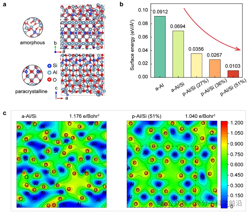 随后,利用VASP分析了材料表面能和电荷密度分布的情况,结果如图3所示,其中非晶态样品(a-Al/Si)比次晶相态样品(p-Al/Si)的表面能更高,同时随着次晶相态形成占比的增加,表面能逐渐降低。此外,Si元素掺杂能够促进表面能的进一步降低。理论计算结果还表明,针对p-Al/Si(51%)这种高次晶相态占比的样品,其表面电荷分布显得更加均匀,这主要是由于次晶相态形成过程中原子排列重新分布导致电荷密度分布也逐渐均匀化,进而降低了表面能。
