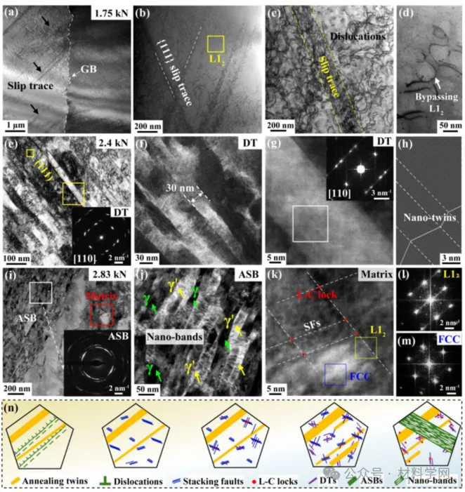 (k)矩阵中包含SFs和l - c锁相的HRTEM图,以及(l)变形的L12相和(m) FCC相对应的FFT图;