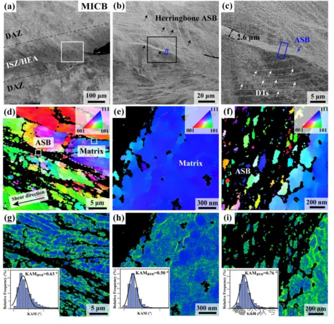 (e, h) ASB外(TKD测试)和ASB内(f, i)区域(TKD测试)的矩阵区域。