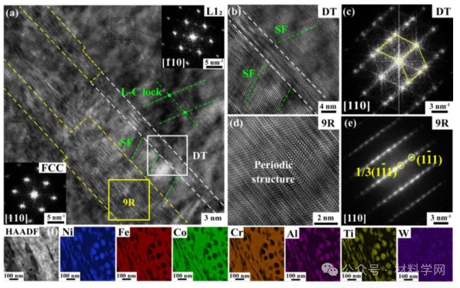 (a) HRTEM整体模式,包括γ/γ′相、SFs、DT和9R相;
