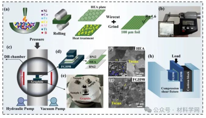 (f) HEA箔和(g) FGH98高温合金的相应组织;(h)节点压剪试验过程。