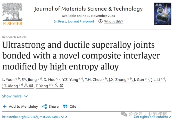 composite interlayer modified by high entropy alloy”发表在Journal of Materials Science & Technology上