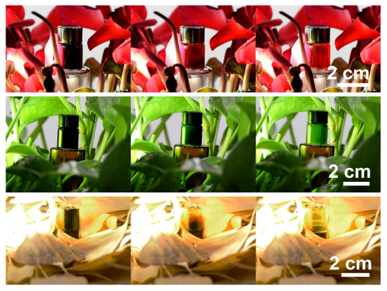 同时,材料还能在红色仙客来、黄色银杏和绿色黄金葛三种不同的植物丛中,识别出环境颜色并“隐匿”其中,提高了材料的应用性。