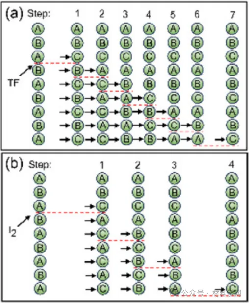 图9. 分别通过双层孪晶缺陷(a)和I2SFs(b)形成面心立方(FCC)相的机制示意图。
