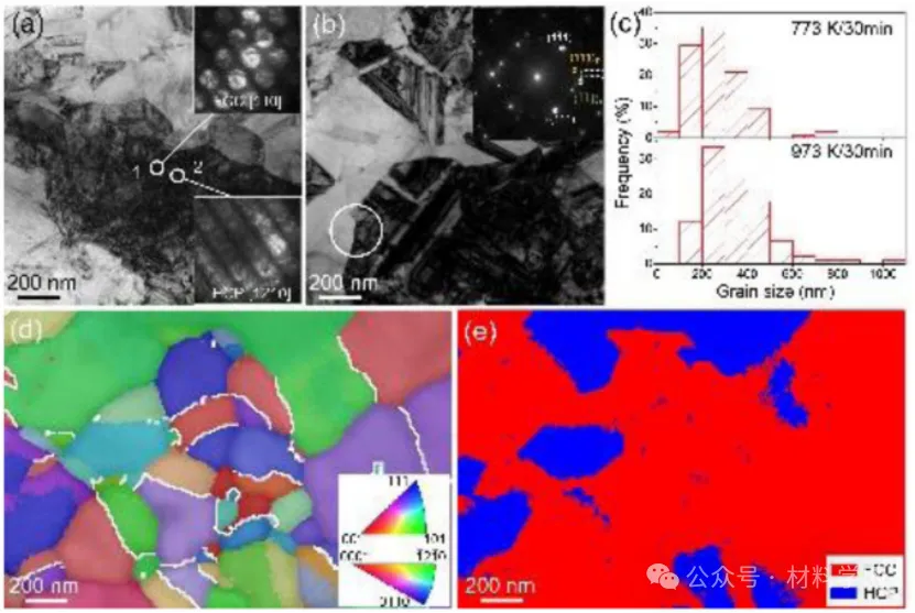 (c)晶粒尺寸分布,(d - e)在973K下退火的样品的典型透射菊池衍射(TKD)反极图(IPF)图像和相图。