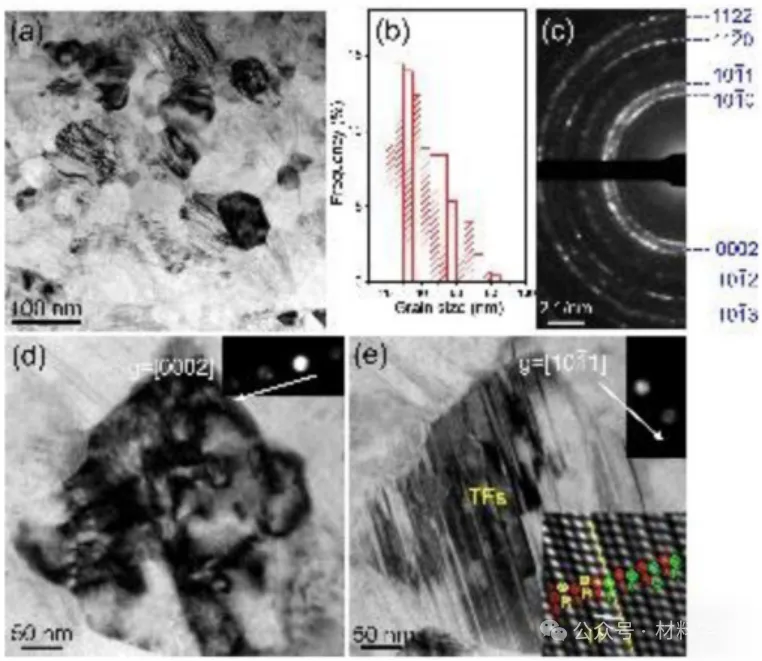 经过10圈高压扭转(HPT)处理的纯钴的微观结构特征。(a)明场透射电子显微镜(TEM)图像,(b)相应的晶粒尺寸分布,(c)相应的选区电子衍射(SAED)花样。(d - e)分别采用g = [0002]和g = [101]拍摄的双束明场图像,展示了基面层错,(e)的插图展示了一个孪晶缺陷的堆垛顺序。