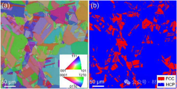 图1. 通过电子背散射衍射(EBSD)测量的粗晶纯钴的典型反极图(IPF)(a)和相图(b)。