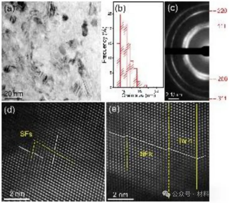 (d - e)原子尺度的高角环形暗场扫描透射电子显微镜(HAADF - STEM)图像,展示了极细纳米晶钴中高密度的层错和变形孪晶。