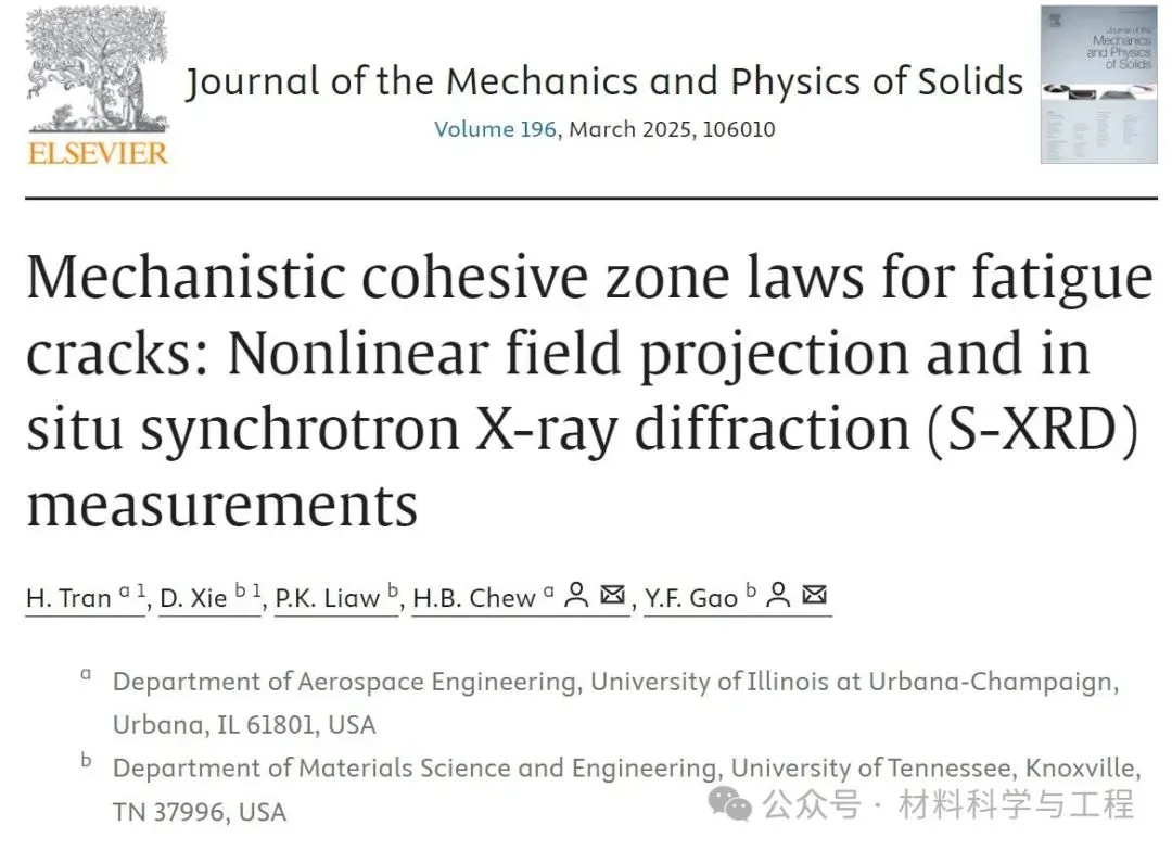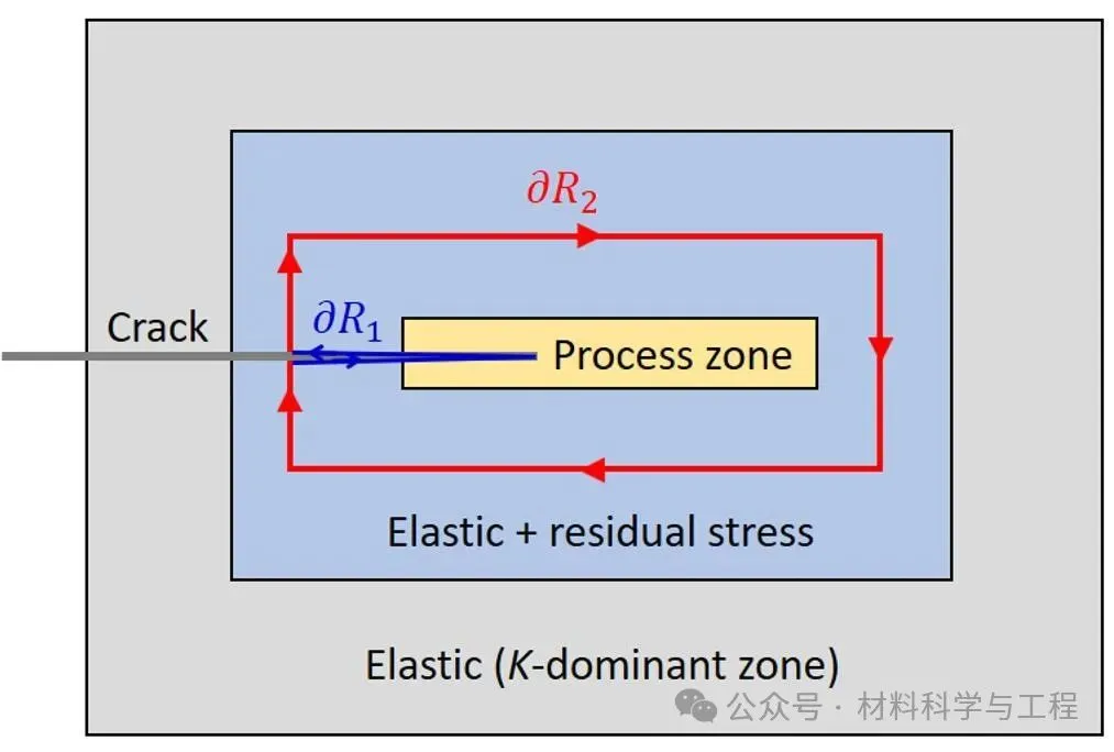 图1裂纹尖端周围包括“杂乱”的过程区(包括各种损伤过程)和“整洁”的过程区(塑性变形过程),而“杂乱”的过程区可以用粘结模型来表示。 图2 疲劳裂纹模拟引入的多种不可逆性和迟滞性规律,包括卸载-再加载滞回、同时具有滞回与再加载不可逆性、弹性类型卸载时存在永久分离、以及本工作通过非线性场正交分解法和同步辐射测量的弹性应变场确定的镁合金粘聚区规律。 如前所述由于无法观察到这些损伤演化过程,本文创新性的提出了以下方法: (1) 通过同步辐射X射线衍射测量疲劳裂纹尖端附近的晶格应变场 (空间分辨率为亚毫米级别),从而得到了,具体过程如示意图3所示。 图3 采用同步辐射X射线衍射进行应变映射测量的装置示意图。在NFPM中使用最后一个周期的完全卸载状态作为参考,利用Debye-Scherrer环的畸变可以提取平面内弹性应变张量。 (2) 将零载荷构型作为新的参考,通过定义一个新场。若沿时间逆推,此场及其对应的应力场均呈弹性特性。 (3) 现采用一组已知的辅助弹性场 (如位于粘聚区具有一对点力的Green方程),并结合Maxwell-Betti互易定理,针对如下所示的两条路径进行分析,如图4所示。 图4 近裂纹尖端的三个不同区域的示意图,用于通过非线性场正交分解法重构疲劳裂纹尖端粘聚区规律。 (4) 通过使用由同步辐射X射线衍射构建的场以及由Green方程得到的场,我们能够求解界面牵引力和离散函数。 论文链接:https://doi.org/10.1016/j.jmps.2024.106010 来源:材料科学与工程