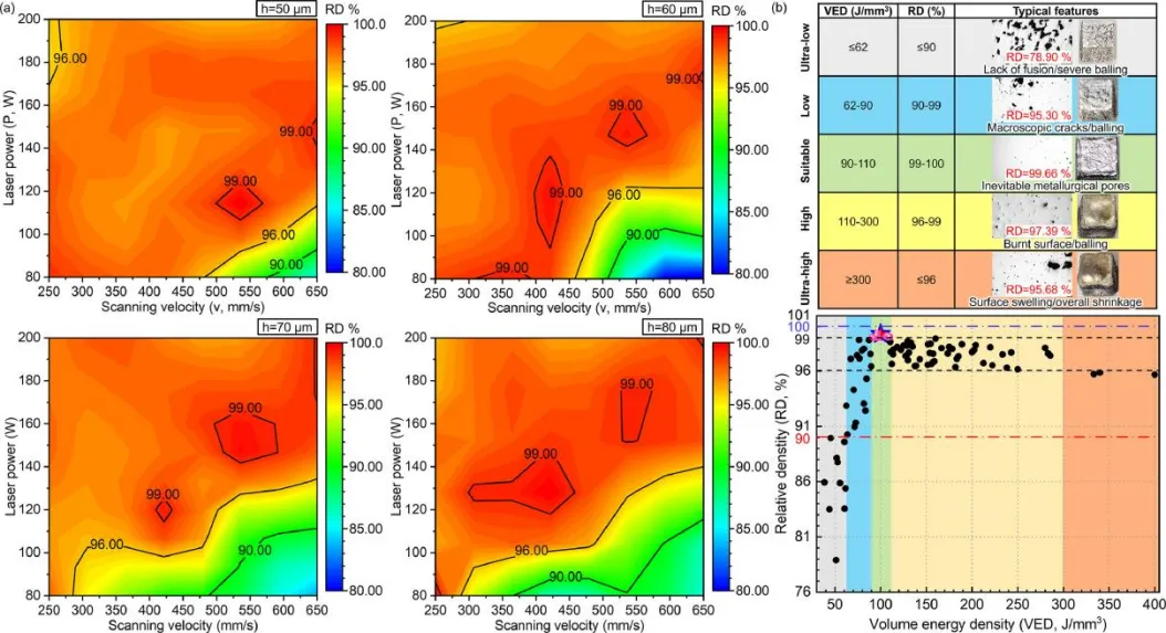 在本研究中,广东省科学院新材料研究所和伯明翰大学的团队联合,以WE43合金为对象,系统研究了激光功率、扫描速度和扫描间距等对合金的影响。结果表明,当激光输出处于过渡模式(VED为90-110J/mm³),且工艺参数为P=80W、v=250mm/s、d=50μm时,能制备出孔隙率仅0.85±0.021%的近全密度样品,其机械性能良好,屈服强度351MPa、极限抗拉强度417MPa、断裂伸长率6.5%、显微硬度137.9±6.15HV0.1。