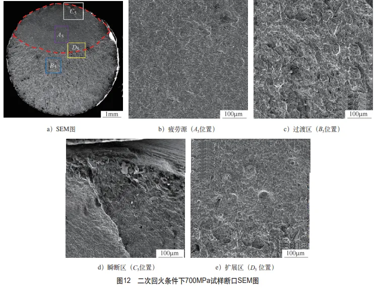 致命元凶:循环应力导致表面微小裂纹→疲劳失效→寿命骤降。行业困境:传统一次回火工艺下,夹杂物尺寸大(15~21μm)、瞬断区面积占比高→裂纹易萌生。破局关键:二次回火工艺优化组织均匀性,显著提升抗疲劳性能!S-N曲线实锤:在600~800MPa高应力下,二次回火试样寿命远超一次回火(见图5)。瞬断区面积减少:DT-800条件下瞬断区占比仅25.1%,抗断裂能力更强(表4)。二次回火后夹杂物平均直径降至10~17μm(一次回火为15~21μm),减少裂纹萌发风险(图9)。SEM图对比:二次回火试样断口“鱼眼”形貌更少,组织分布均匀(图11~13)。基于Tanaka-Akiniwa模型,二次回火后ΔK值更低→应力集中风险下降(表5)。第二次回火:相同参数(560℃×120min)再处理一次。效果验证:硬度487HV,抗拉强度1779MPa,伸长率11.5%。石化装备企业:优先采用二次回火工艺,可延长碟簧寿命,减少停机维修成本。热处理厂:优化控温精度,确保两次回火参数一致,避免组织不均匀。工程师必看:定期检测夹杂物尺寸,结合SEM分析断口形貌,动态调整工艺。注意边界条件:当加载应力<600MPa时,二次回火优势不明显(见图5)。潜在风险:过度回火可能导致硬度下降,需平衡强度与韧性。未来方向:结合AI算法预测最佳回火次数,实现定制化工艺。