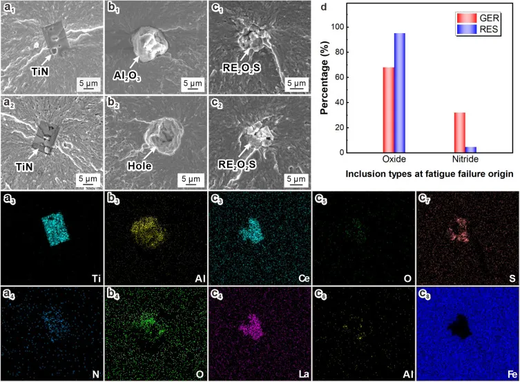 图2. 在疲劳起始点的对称扫描电子显微镜(SEM)形态,展示了同一疲劳断裂试样的两个半部及不同类型夹杂物的能量色散X射线光谱(EDS)分析。(a1-a4) GER钢中的立方氮化物(TiN);(b1-b4) GER中的单一球形氧化物(Al2O3);(c1-c8) RES钢中的RE2O2S;(d) 两种轴承钢在疲劳起始点的不同类型夹杂物的百分比。