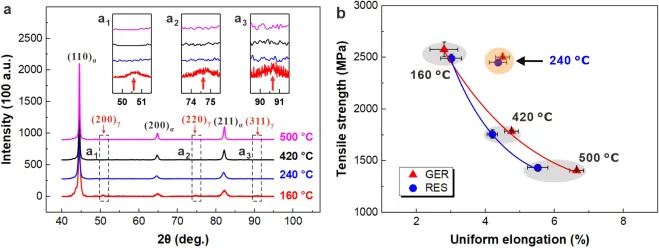 图9. 在不同回火温度下获得的GER钢和RES钢在不同微观结构状态下的拉伸和疲劳性能。(a) 不同回火温度下RES轴承钢的XRD图谱。(b) 两种轴承钢的抗拉强度与均匀延伸率之间的关系。误差条表示测量的相应抗拉强度和均匀延伸率的变化范围。