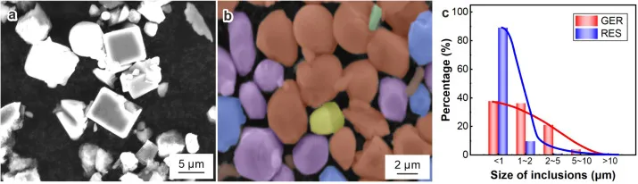 图6. GER钢和RES钢中不同类型夹杂物的扫描电子显微镜(SEM)形态。基于电解法提取的夹杂物的三维扫描电子显微镜形态,分别为(a)GER钢和(b)RES钢。(c)两种轴承钢中通过金相方法检测到的夹杂物的尺寸分布。