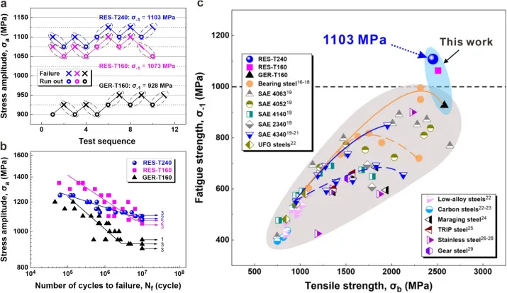 图10. 本研究中两种轴承钢的疲劳强度评估与其他钢材的比较。(a) 疲劳强度测试的阶梯图和(b) 不同回火温度下两种轴承钢的应力幅值与循环次数(S-N)曲线。(c) 本研究中两种轴承钢的抗拉强度与疲劳强度之间的关系,以及各种已报道的高强度钢的对比。