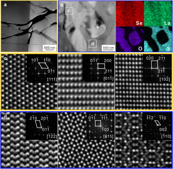 图3. 不同类型夹杂物内部的扫描透射电子显微镜(STEM)形态。(a) GER钢中球形氧化物(Al2O3)的高角环形暗场(HAADF)图像。(b) RES钢中RE2O2S的透射电子显微镜(TEM)明场(BF)图像。(c) 和(d) 分别为(b)中氧化物夹杂物和硫化物夹杂物的高分辨率HAADF-STEM图像及相应的选区电子衍射(SAED)图案(插图)。