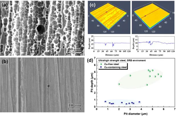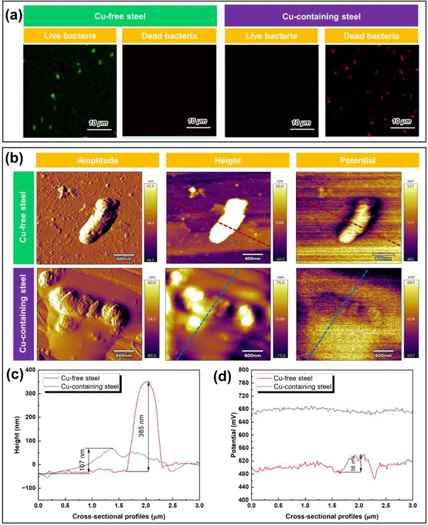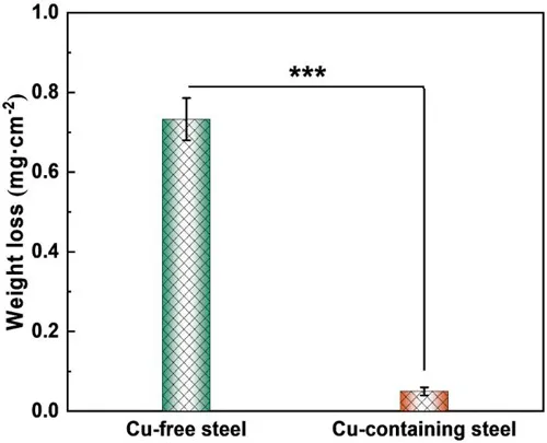 微生物腐蚀(MIC)已成为威胁海洋工程、油气输送和医疗器械等国家重大工程领域装备安全运行的重大挑战。其中,硫酸盐还原菌(SRB)等微生物引发的局部腐蚀因其隐蔽性强、破坏性大等特点,被称为材料失效的“隐形杀手”。在强腐蚀介质、动态载荷与微生物膜协同作用的极端工况下,传统高强钢材料长期面临强度、耐蚀性与抗菌性能难以兼顾的困境。开发兼具超高强度、优异耐蚀性和高效抗菌性能的新型结构材料,已成为国际材料科学领域亟待突破的关键技术难题。针对这一重大需求,中国科学院金属研究所孙成研究员团队联合王威研究员团队及新加坡南洋理工大学Upadrasta Ramamurty教授团队,创新性地提出“析出调控—耐蚀设计—表面功能”三位一体协同设计理念。研究团队通过精确调控Cu元素在钢中的富集行为,成功构建了以Cu富集纳米析出相为核心的“力学性能-耐蚀性-抗菌性”协同增强机制,研制出具有突破性性能的新型超高强纳米析出相强化钢。该材料的创新设计体现在:(1)通过精准的材料设计和热处理工艺,实现Cu元素在钢基体中的纳米级析出相可控分布;(2)利用析出相的弥散强化效应提升材料强度的同时,通过Cu离子的缓释作用赋予材料持久的抗菌性能;(3)通过微观组织结构的优化设计,实现材料强度、耐蚀性和抗菌性能的协同提升。系统的研究表明,富Cu纳米析出相在钢材性能提升中发挥着多重关键作用:首先,持续释放的Cu离子能有效快速杀菌,从而抑制SRB在钢表面的黏附和繁殖;其次,纳米析出相的弥散分布使钢材获得高达1.8 GPa的抗拉强度,同时保持优异的耐蚀性能。在模拟SRB腐蚀环境的加速试验中,新型钢材的腐蚀速率较对照组(未含铜纳米析出相)降低约14倍,展现出卓越的抗局部腐蚀能力。研究还建立了析出相结构调控与抗菌/耐蚀机制的定量关系模型,阐明了Cu富集纳米析出相通过调控材料表面微区电化学环境,实现抑制生物膜形成和延缓腐蚀进程的协同作用机理。这一成果不仅解决了超高强钢在微生物腐蚀环境中性能失衡的技术瓶颈,更为设计开发新一代多功能结构材料提供了重要的理论指导和工程借鉴。相关研究成果以“Cu-rich nano precipitates simultaneously enhance the tensile properties,antibacterial efficacy,and corrosion resistance of ultra-high strength steel”为题,发表于金属材料科学领域著名期刊《Acta Materialia》。金属研究所韦博鑫副研究员和牛梦超项目研究员为论文共同第一作者,金属研究所王威研究员、湘潭大学吴堂清教授和新加坡南洋理工大学Upadrasta Ramamurty教授担任共同通讯作者。本研究获得了国家自然科学基金和新加坡科学、技术和研究局结构金属合金项目的资助支持。该技术的工程化应用将为我国重大基础设施的长期安全服役提供重要的材料保障。图1. 钢中Ni₃Ti与富Cu析出相的原子探针层析(APT)三维重构分析图4. 钢在SRB接种溶液中浸泡14天后的腐蚀失重结果