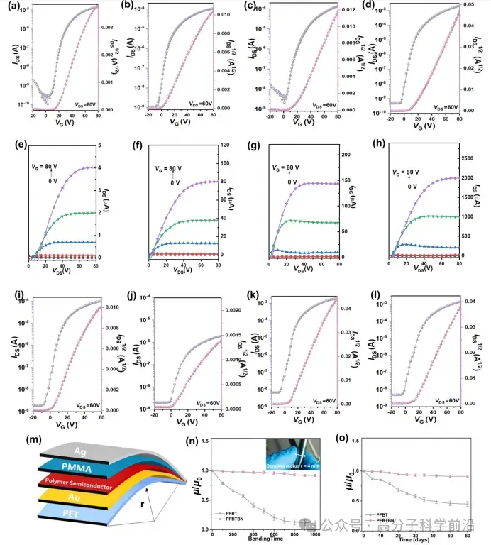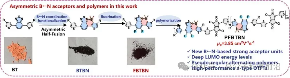 聚合物半导体材料因其在机发光二极管(OLED)、有机太阳能电池(OPV)和有机薄膜晶体管(OTFT)等光电器件中的广阔应用前景,受到了工业界和学术界的高度关注。其中,OTFT器件在柔性电子、电子皮肤和射频识别(RFID)技术等领域展现出极大的商业潜力。然而,当前单极性n型聚合物OTFT器件普遍存在电子迁移率较低的短板,这严重制约了低功耗、高信噪比以及抗干扰能力优异的p-n互补逻辑电路的开发。为解决这一挑战,硼氮配位修饰策略作为一种有效的分子工程手段,在制备高性能n型聚合物半导体材料方面发挥了重要作用。通过硼氮配位键的构建,不仅能够显著降低分子的最低未占有分子轨道(LUMO)能级,同时还能通过引入稳定的稠环结构,增强分子骨架的刚性,扩大π-π共轭体系的尺度,从而促进载流子的跃迁与传输,最终提升材料的电子迁移率。然而,目前硼氮构筑单元的种类仍然相对有限,尤其是电子迁移率超过1 cm² V⁻¹ s⁻¹的单极性n型硼氮类聚合物半导体的报道仍然较少,且该类材料迁移率提升的分子机制尚未完全阐明。。基于此,复旦大学智能材料与未来能源创新学院刘云圻院士/王洋团队与宁波材料所葛子义团队开展了系统研究。他们通过分子工程策略,成功设计合成了新型不对称B←N功能化苯并噻二唑(BT)系受体单元。这种创新的分子构架不仅保留了BT的优异电子特性,还通过不对称的B←N官能团化,进一步优化了分子的电子结构和晶体特性。基于此,他们进一步合成了一系列不对称B←N功能化BT系聚合物(PBTBN,PFBTBN),通过精细调控分子结构,成功开发出电子迁移率高达3.85 cm² V⁻¹ s⁻¹的单极性n型硼氮类聚合物薄膜晶体管(如图1所示)。这一研究成果以题为《Asymmetric B←N Functionalized Benzothiadiazoles for High-Performance n-Type Semiconducting Polymers》于近日发表在《AngewandteChemie-International Edition》期刊上。复旦大学智能材料与未来能源创新学院(材料科学系)硕士毕业生焦柯炜和宁波材料所宋伟为共同第一作者,复旦大学刘云圻院士、王洋青年研究员/宁波材料所葛子义研究员为通讯作者,复旦大学智能材料与未来能源创新学院(材料科学系)为第一通讯单位。
