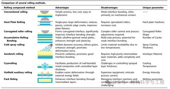 轧制复合技术凭借污染小、稳定性好与效能高等优势,成为金属异质复合板成形制造的重要手段之一。表1系统梳理了多种新型轧制复合成形工艺,构建起了覆盖基础研究到工程应用的轧制复合成形技术谱系。