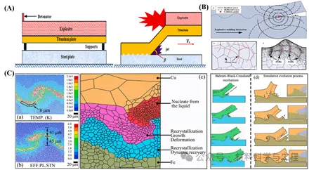 图9. (A)爆炸焊接示意图;(B) (a)应力波在撞击点的传播;(b)应力分布;(c) AZ31B镁合金板中asb的形成;(C) (a, b)温度、应变、局部组织扩增的晶粒分布图;(C)晶粒分布及波浪演化示意图