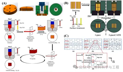 图8. (A)挤压装置及AEB工艺流程图;(B) CAEB过程原理示意图;(C)非均质变形模型图