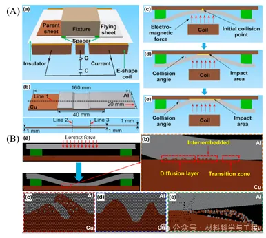 图10. (A) Al-Cu异种合金拉伸搭接剪切试样的EMPW工艺示意图;(B) Al-Cu异种合金拉伸搭接剪切试样EMPW工艺示意图