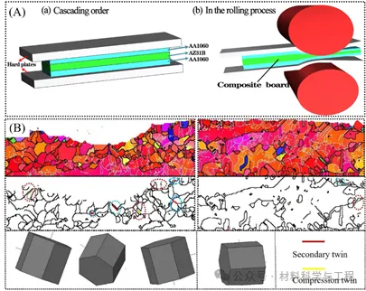 图 3. (A) 衬板轧制工艺原理;(B) 有无衬板轧制Al/Mg/Al复合板界面孪晶对比