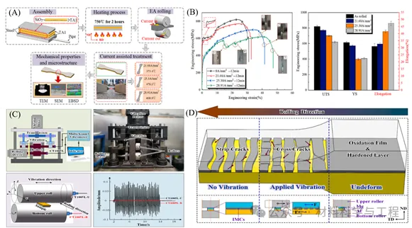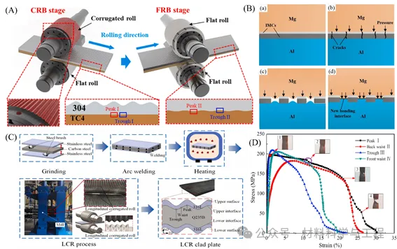 图4. (A)波纹辊结合(CRB)阶段及平辊结合(FRB)阶段;(B)平面Mg/Al复合板槽位IMCs断裂过程; (C) LCR过程示意图;(D) Cu/Al波纹复合板在不同位置的拉伸力学性能
