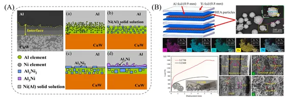 图12. (A) Ni夹层CuW/Al复合板界面微观结构演变示意图:(a)初始溶解阶段,(b)IMCs形成阶段,(c)IMCs生长阶段,(d)冷却阶段;(B) HEA颗粒堆积、形貌及断裂韧性试验结果