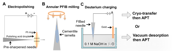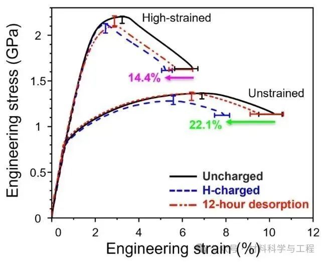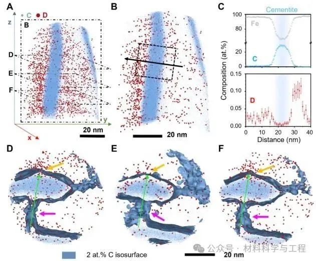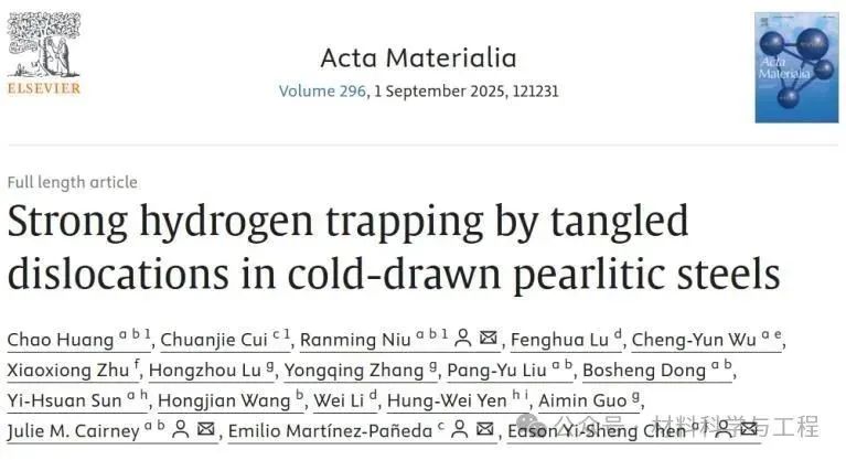 可扩散氢原子在钢材中的存在会导致钢材发生氢脆,损害其结构完整性。一种潜在的解决方案是在钢材的微观结构中引入强氢陷阱,以固定氢原子,阻止其扩散到应力集中区域(即氢脆最易发生的区域)。然而,制造具有有效强氢陷阱的材料通常需要添加昂贵的合金元素,这无疑增加了生产成本,阻碍了该策略在钢铁工业中的应用。在本研究中,悉尼大学联合牛津大学、南洋理工大学的研究人员以珠光体钢作为模型材料,通过冷拔工艺引入高密度的位错,并且使这些位错在渗碳体-铁素体界面处聚集并缠结。这不仅提高了钢材的强度,还使其氢脆敏感性降低,令氢脆不易发生。研究人员使用环境可控的三维原子探针技术直接证实,这些缠结位错能牢固地捕获氢原子,阻碍氢原子的扩散,从而使该钢材表现出较低的氢脆敏感性。该发现为生产兼具高强度和高抗氢脆的金属材料提供了一条途径,强调了利用晶体缺陷作为经济且高效氢陷阱的潜力。 背景介绍: 氢在结构材料中的吸收会导致氢脆,大幅度地降低材料的韧性,这对用于氢气运输和储存的钢结构系统构成极大的失效风险,使得此类钢材的维护成本增高,并严重威胁脱碳与氢能经济大规模应用的进程。为降低钢材发生氢脆的风险,需在金属部件生产开始过程中便尽量减少氢吸收,比如,在热处理期间控制钢材与潮湿环境的接触面积,或对钢材进行烘烤处理以去除其内部吸收的氢,此外,也可以施加表面涂层以减缓氢的吸收。更巧妙的方法是,利用材料本身的晶体缺陷作为氢陷阱来减少自由扩散氢的量,从而降低氢原子聚集而引发的裂纹萌生和扩展的可能性,最终减缓氢脆现象。然而,氢陷阱的有效性仍存争议,传统理论认为强陷阱(如结合能>70 kJ/mol)可能快速释放氢,且缺乏实验验证。 在过去的研究中,科学家们利用热脱附光谱(TDS)测量氢吸附与脱附的情况来判断氢陷阱的存在与类型,但无法明确具体是何种晶体缺陷扮演何种氢陷阱;三维原子探针(APT)技术可以直接观察氢在特定微观结构(如位错、晶界、碳化物)中的捕获情况,结合低温转移(cryo-transfer)技术可以提供完整、准确的氢捕获图谱,但该技术受限于仪器本身的视场问题,且样品具有破坏性,无法重复使用来鉴定同一样品中的不同氢陷阱类型。 为了解决这一问题,本研究通过冷拔工艺在模型珠光体钢中引入多种晶格缺陷作为强弱氢陷阱,结合环境可控TDS与APT实验,验证了强陷阱在室温下长期保留氢的能力,并且指明了强弱氢陷阱在脆化过程中表现出的性质,同时通过数值分析与实验结果做对比,揭示了传统氢捕获模型可能在分析纳米结构缺陷上有所不足。此研究成果为开发抗氢脆的高强高抗氢脆合金提供了实验依据和成本效益高的工艺方法,推动了潜在服役于氢能系统的材料设计进展。 全文解析: 图1展示了珠光体钢丝在冷拔过程中的微观组织演变。电子背散射衍射(EBSD)数据展示了无应变、中等应变和高应变钢丝的晶粒尺寸从27.6μm减小到2.19μm,晶粒在变形过程被拉长、破碎。几何必要位错(GNDs)图表明:随着应变增加,位错密度从9.78×1014m⁻²升至25.49×1014m⁻²,显示了变形过程引入了高密度位错。扫描透射电子显微镜(STEM)图像显示渗碳体-铁素体界面附近位错密度急剧增加,特别是高应变样品发生了位错切割渗碳体的现象。透射菊池衍射(TKD)分析进一步确认高应变样品中渗碳体-铁素体界面附近的高位错密度,为研究氢捕获行为与晶体缺陷关系提供了晶体结构上的认识。 图1. 珠光体钢样品变形过程中的组织演变。(A) 展示了珠光体钢丝样品的冷拔工艺流程,标记了无应变(黑色)、中等应变(蓝色)和高应变(红色)三种样品的制造过程。(B-D) 是三个样品的EBSD反极图,叠加了衬度和晶界图。(E-G) 是几何必要位错(GNDs)图,显示位错密度变化。(H-J) 是沿晶带轴下拍摄的三种样品的STEM-ABF图像。(K-L) 是高应变样品的TKD结果,(K) 是带衬度图,(L) 是GNDs图 图2显示了对无应变和高应变条件下的样品,经充氢后通过TDS进行的氢吸附和脱附处理后的氢含量和氢捕获情况的结果。图A无应变样品仅有低温下的氢的峰,表明无应变样品只存在弱氢陷阱捕获氢。而在高应变样品中,除了低温下逸出的氢的峰外,还出现了高温逸出的氢的峰,如图B所示,这表明冷拔过程引入了强氢陷阱。之后研究人员对充氢后的样品进行真空脱附处理后在测量氢捕获情况,发现随着真空脱附时间的延长,弱氢陷阱捕获的氢含量逐渐下降,当脱附时间达到12小时后,弱氢陷阱捕获的氢完全被释放。相反,强氢陷阱捕获的氢含量不随时间变化而变化,表明强氢陷阱对氢的捕获能力很强,可以长时间有效地固定氢原子。之后,研究人员改变不同的加热速率,继续对高应变样品进行TDS实验,得出弱和强氢陷阱与氢的结合能分别为30.2 kJ/mol和47.0kJ/mol。但此时研究人员对强弱氢陷阱的的性质和具体的晶格缺陷类型还不能判断。 图2. 未应变和高应变样品的氢捕获情况。(A) 未应变样品和 (B) 高应变样品的氢脱附曲线(由TDS测得),分别在室温、真空条件下进行无脱附(黑色)、2小时脱附(蓝色)及12小时脱附(红色)。(C) 为图 (B)中黑色虚线区域的放大视图。(D) 高应变样品在三种不同加热速率下的氢脱附曲线:100℃/h(六边形)、150℃/h(三角形)和200℃/h(星形)。(E) 基辛格图,用于估算图(D)中高温(蓝色)和低温(绿色)氢脱附峰对应的氢与氢陷阱的结合能 于