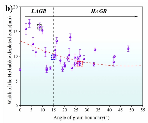 图7 a)氦泡贫化区与相邻晶粒等效尺寸差的关系。b)氦泡贫化区与GB角的关系。