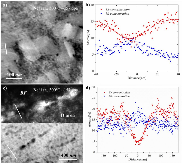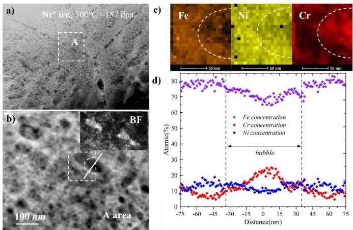 CW试样内300℃ Ne+辐照后1GB处的元素偏析,~157 dpa。a)b)STEM-HAADF和BF图像。c)(b)中白色盒的元素分析图。d)在GB处沿着(b)中的白色直线跨越气泡的元素分布。