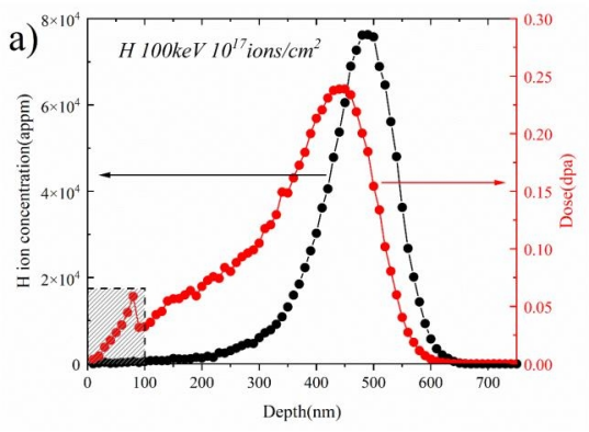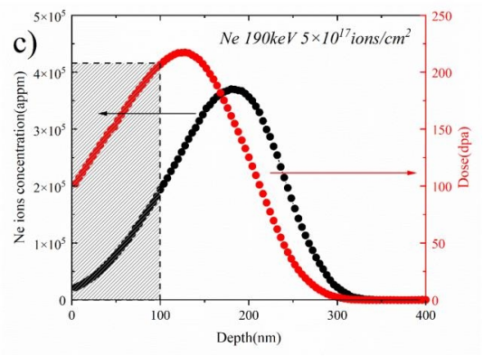 SRIM 2013软件模拟的(a)H+、(B)He+、(c)Ne+辐照样品的辐照剂量和离子随深度的分布。