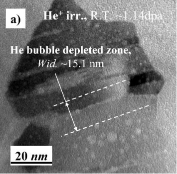 a)b)RT He+辐照后NC样品中He气泡区域和GPA(εxy)的HRTEM图像,约1.14 dpa。