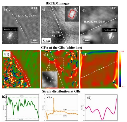 RT He+辐照(~1.14 dpa)后,包括LAGB在内的GB附近He气泡贫化区的微观结构(8.7°),和HAGB a)c)TEM BF图像。b)d)通过掩蔽FFT图像获得的iFFT图像,并且在iFFT图像的插图中可以看到掩蔽过程的衍射点。b1)b2)c1)c2)d1)d2)通过GPA在GB(白色虚线)处的应变(εxy)分析。