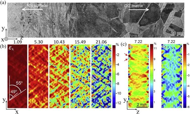 (c)所有层都在塑性变形(塑性-塑性阶段)。软层和硬层具有相同的弹性模量。SMAT制备的GS IF钢中应力和应变分布的CPFEM分析: