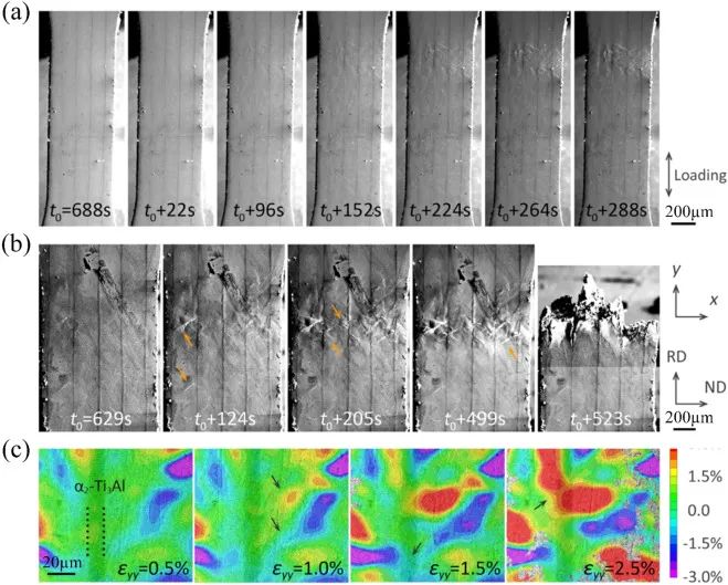图30 (a)变形过程中损伤累积的宏观和(b)局部放大SEM图像;(c)不同宏观应变下异质Ti/Ti3Al层压板沿着y方向的基于SEM的DIC映射。