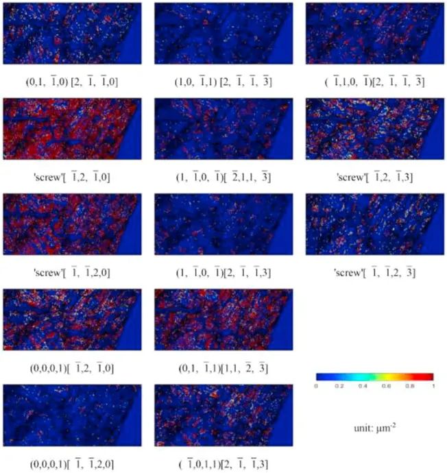 图7 TC11钛合金中不同滑移系的单个GND密度。