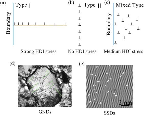 (3)深入研究了HSMs的变形机制,将其分为弹性变形、弹性-塑性变形、塑性变形三个阶段,阐明了各阶段中应力应变变化、位错行为及HDI应力和硬化的产生过程。