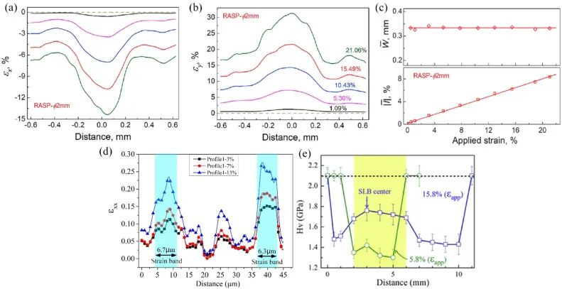 图28 当拉伸应变从1.09%增加到21.06%时,代表性SB上的应变演变和GS Ni表面上的应变峰特征:(a)应变εx,(b)应变εy,(c)应变峰半峰处的平均宽度和平均应变峰高的演变;(d)在LS Mg-1Gd/Mg-13Gd层压板的不同宏观应变下,沿图27(e)中描述的曲线1的应变沿着xx;(e)在不同应变下GS IF钢的局部SB中硬度值的变化。