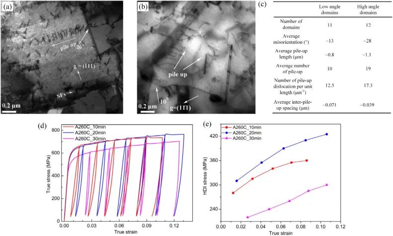 图17 3%塑性应变后,HLS黄铜(a)高角度畴界(>15°)和(B)低角度畴界(5°-15°)处GNDs堆积的TEM图像。(c)畴界处GNDs堆积的统计分析。(d)LUR曲线和(e)不同样品的HDI应力演变。