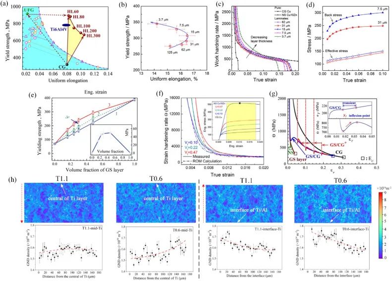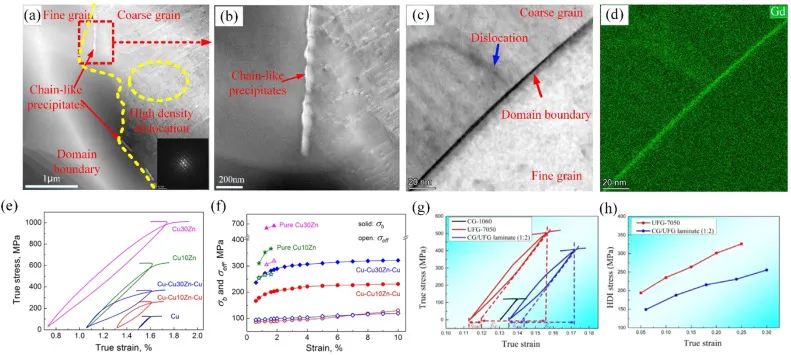 图23 (a)包括CG和FG区域的TEM图像和(b)边界处沉淀物与位错之间相互作用的详细视图;(c)包括CG和FG区域的TEM图像和(d)边界处偏析的Gd溶质原子与位错之间相互作用的高倍放大图;(e,g)LUR曲线和(f,h)Cu/Cu-Zn、1060/7050Al层压板及其样品随应变增加的HDI应力发展。